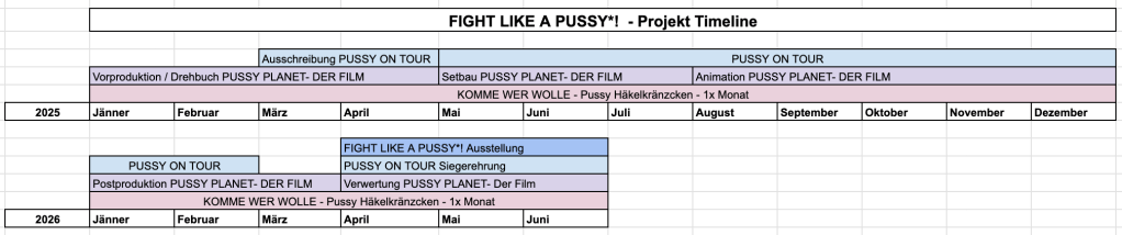 Am Ende des Projektzeitraumes werden alle drei Ebenen in einer großen Ausstellung – FIGHT LIKE A PUSSY zusammengefasst: Häkelkränzchen in der Galerie, die besten Fotos von PUSSY ON TOUR und das Filmset von PUSSY PLANET- DER FILM werden ausgestellt.